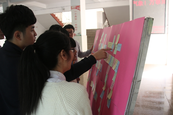 机电工程学院在理工一一楼大厅开展 “我想对你说”活动中,同学们在心语心愿展示板上写下最真诚的话语,献上最美好的祝福。有来自女生对自己的祝福:“希望自己越来越青春靓丽”; 有来自女生对大家的祝福“祝福大家友谊长存,幸福快乐一辈子。”;有来自整个班级男生的祝福:“祝福全体女生平平安安快乐一辈子。”……一句句温暖的话语,一个个美好的祝愿,都会随着彩色的字条,传递到机电工程学院的每一位女生。