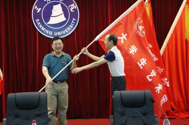 动员会上,江芳俊副校长为“追忆长征精神·传承红色基因”巡演出征授旗,并提出三点希望:一是要信心满满,弘扬正能量。江副校长表示,作为三明市最高学府,艺术团的许多同学有着丰富的演出经验,此次参加巡演的多个节目还获得全省一、二等奖,并受邀全省巡演,因此要有足够信心做好巡演工作,希望同学们借助巡演的大舞台,积极向革命老区人民弘扬正能量精神。二是加紧排练,展现风貌。台上10分钟,台下10年功,前往各县(市)展演是展示学校形象、展现我校学子精神风貌的良好机遇,希望全体演职人员肩负着宣传学校形象的重任,加紧排练,把每一句话、每一个动作、每一个表情都雕琢到位,高水平、高质量地完成巡演工作,给革命老区人民留下良好印象,为学校增光添彩。三是要严于律已、提升自我。全体演职人员要服从安排、统一行动,希望演职人员能够通过演出磨炼提升自我才能和综合素质;要充分利用前往革命老区巡演的机会,在每场演出中吸取力量和养分,充分展示艺术才华和天赋。