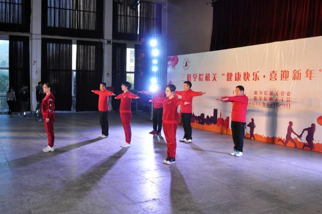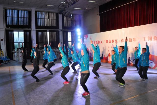 2017新年来临之际,为推进健康校园建设和精神文明建设,促进教职工身心健康,增强机关的凝聚力,12月29日下午,我校机关教职工举行“健康快乐·喜迎新年”工间操比赛,来自机关的13支工会小组代表队参加了比赛。校领导曾祥辉、刘健、赖锦隆、陈晓明到场观看,刘健校长还以普通会员身份参加了所在工会小组的比赛。体育学院6名专业体操教师担任本次比赛评委。