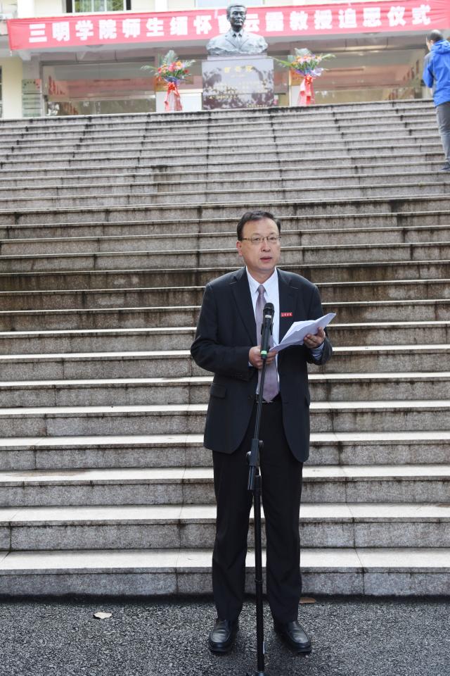 高尚品格长流传。“他用生命铸就不朽师魂,给我们留下了一笔宝贵的精神财富,曹教授的音容笑貌将永留心中……”刘健校长怀着崇敬和思念之情追忆了曹云露教授生前岁月的点点滴滴,讲述了学校近年来的事业发展。他说,在曹云露教授精神的感召下,全校师生奋发有为、追求卓越,学校取得了一项又一项显著的办学成果,智能制造产业学院、三明市铸锻行业协会在曹教授生前所在的机电工程学院成立,为学校 “转型、提质、增值”发展再添一抹绚丽色彩。他希望,每一位教师能像曹云露教授那样,成为让学生难忘的恩师、让学校自豪的名师、让社会敬重的高师;每一个同学,弘扬践行“明德、明理、明志”校训精神,实现全面发展,健康成长成才。