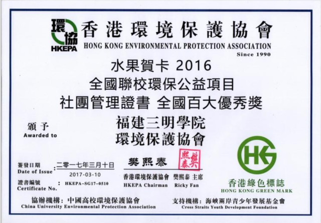 为鼓励全国环保类社团进一步做好环境保护工作,表彰为环保事业做出不懈努力的集体,香港环境保护协会开展2016年全国联校环保公益项目百大优秀奖评选活动。近日,从香港环境保护协会传来喜讯,我校学生社团——三明学院环境保护协会“水果贺卡”环保公益项目获得全国百大优秀奖,至此,三明学院环境保护协会自2014年获得该类表彰以来已经两次荣获香港环境保护协会表彰。