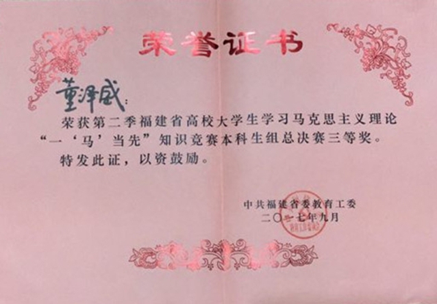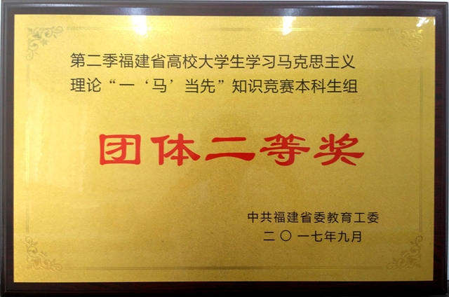 9月23日,由省委教育工委主办的第二季福建省高校大学生学习马克思主义理论“一‘马’当先”知识竞赛总决赛在福州落幕。我校荣获总决赛团体第二名(二等奖),文化传播学院董泽威同学获得个人三等奖。省委常委、宣传部长高翔,省委教育工委副书记王建南等领导莅临现场观看,并为获奖团体和个人颁奖。校党委书记兰明尚、副书记廖景榕一同到场观看。