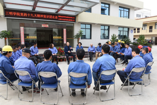 宣讲团员、马克思主义学院院长曾令超教授走进福建省昌明机械铸造有限公司,用历史比较的方式辩证讲解了中国共产党人不忘的“初心”就是“为中国人民谋幸福,为中华民族谋复兴”,用发展的哲学思维从“新主要矛盾”“指导思想”“旗帜内涵”“奋斗目标”讲解了中国特色社会主义进入了“新时代”。公司20余名员工到场聆听,大家表示,“作为企业员工,我们非常关心、关注党的路线、思想、战略,希望这样的理论宣讲多一些,为我们更好地解疑释惑。”