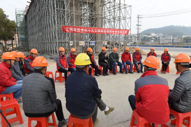 宣讲团员、建筑工程学院党委书记邹晓芟教授走进中铁五局534工地,与20余名工地管理、施工人员围坐在一起,现场讲解了党的十九大主题的基本要义,回顾了十八大以来国家取得的伟大成就,解析了习近平新时代中国特色社会主义思想,阐释了新时代社会主要矛盾以及新征程基本方略。“此次宣讲,形式新颖,跟大家近距离面对面交流,以生活化的语言、乐于接受的方式,将党的十九大精神讲得透彻、明白,效果很好。”工地负责人如是评价。