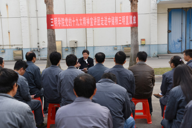 宣讲团员、管理学院院长谢松明教授走进中储粮三明直属库,与30余名工人进行面对面交流,紧紧围绕党的十九大报告的深刻内涵和基本要义,深刻阐释了党的十九大的鲜明主题,深入分析了我国社会主要矛盾的变化,系统讲解了习近平新时代中国特色社会主义思想、我国经济社会发展和“两个一百年”奋斗目标的战略部署,诠释了坚定不移推进全面从严治党的重要意义。