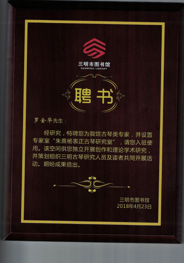 据悉,旅游学院(经济学院)近年来致力于文旅融合,在校内外开展文化传承与发展工作,并取得显著成绩。在4月23日世界读书日活动之际,三明市图书馆聘罗金华教授为古琴类专家,并设置专家室“朱熹杨表正古琴研究室”,供其开展创作和理论学术研究,更好地为市民提供“智哺”服务。