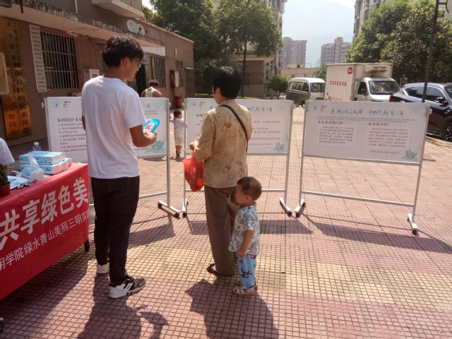 活动当天,实践组全体成员分工协作,准备好宣传活动需要的展板、展架、传单、调查问卷和奖品等前往桃源社区。实践组的一部分成员布置展架和摆好奖品,另一部分成员到小区的各个地方分发环保知识传单。场地布置完毕,陆陆续续地有社区居民围观询问,实践组成员耐心的解答有关环境保护的相关知识。居民们不仅兴致勃勃地听实践组成员宣传环保知识,并在实践组成员的引导下认真的完成问卷调查。