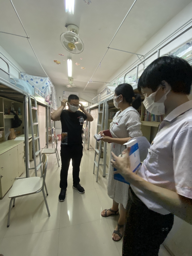 在紫荆园1号楼,教育与音乐学院老师们模拟了在对学生进行晨午晚检时发现学生提问异常情况的应急处置。从发现体温异常,到引导学生到临时隔离观察区进行再次体温检测,再到转诊、宿舍消杀等环节,教音学院对学生在宿舍发生体温异常的处理流程进行了全方位模拟、演练。