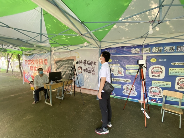 在学校北门入口处组织的模拟返校学生体温异常情况应急处置,覆盖了学生入校体温检测、人脸识别、行李、鞋底消毒、引导体温异常者至临时留观点、重测体温、上报信息、心理安抚、转诊、消毒等环节,完整模拟了发热病例的处理流程。