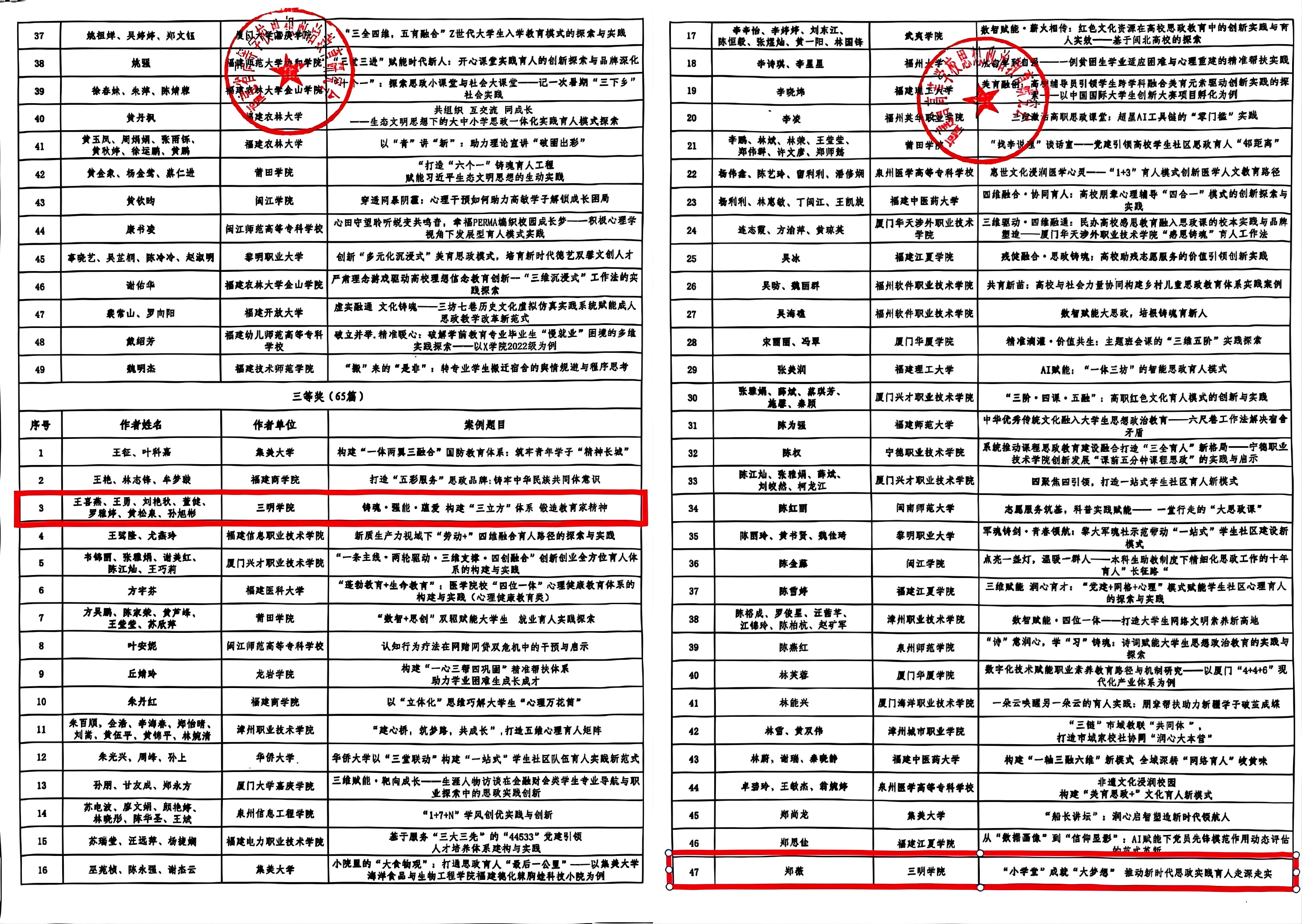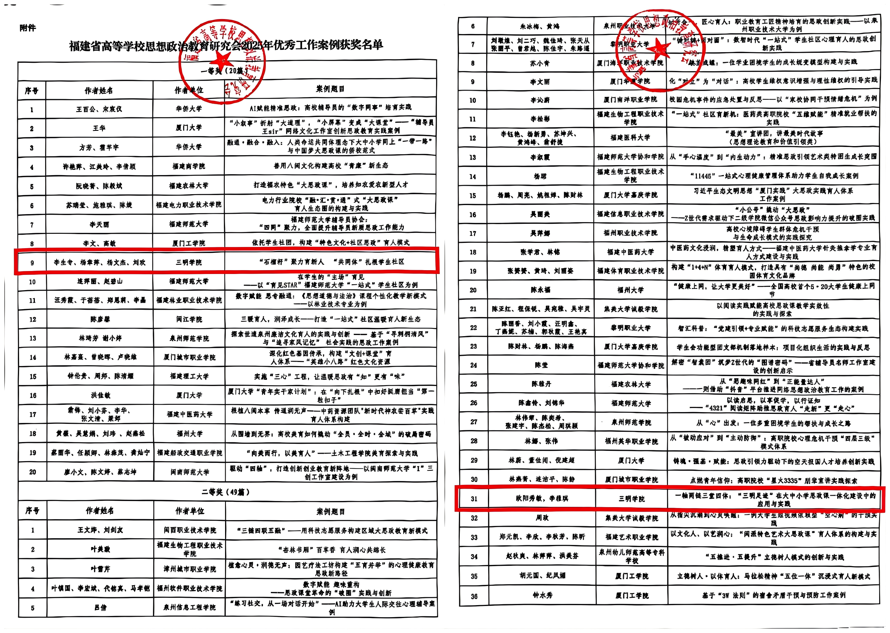 10月11日,福建省高等学校思想政治教育研究会公布《关于表彰福建省高等学校思想政治教育研究会2025年优秀工作案例的通知》。我校思想政治教育成果再获佳绩,《“石榴籽”聚力育新人 “共同体”扎根学生社区》荣获一等奖,《一轴两链三堂四体:“三明足迹”在大中小学思政课一体化建设中的应用与实践》荣获二等奖,《铸魂·强能·蕴爱 构建“三立方”体系 锻造教育家精神》《“小学堂”成就“大梦想” 推动新时代思政实践育人走深走实》分别荣获三等奖。