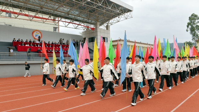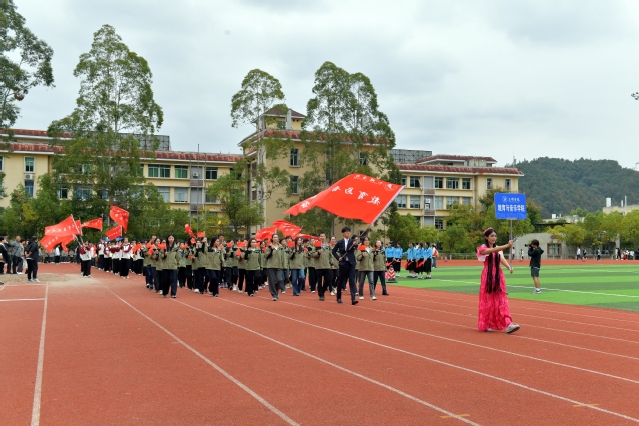 在《运动员进行曲》的激昂鼓点声中,国旗、校旗、彩旗、裁判员与各代表队迈着整齐步伐,喊着铿锵口号依次走过主席台。