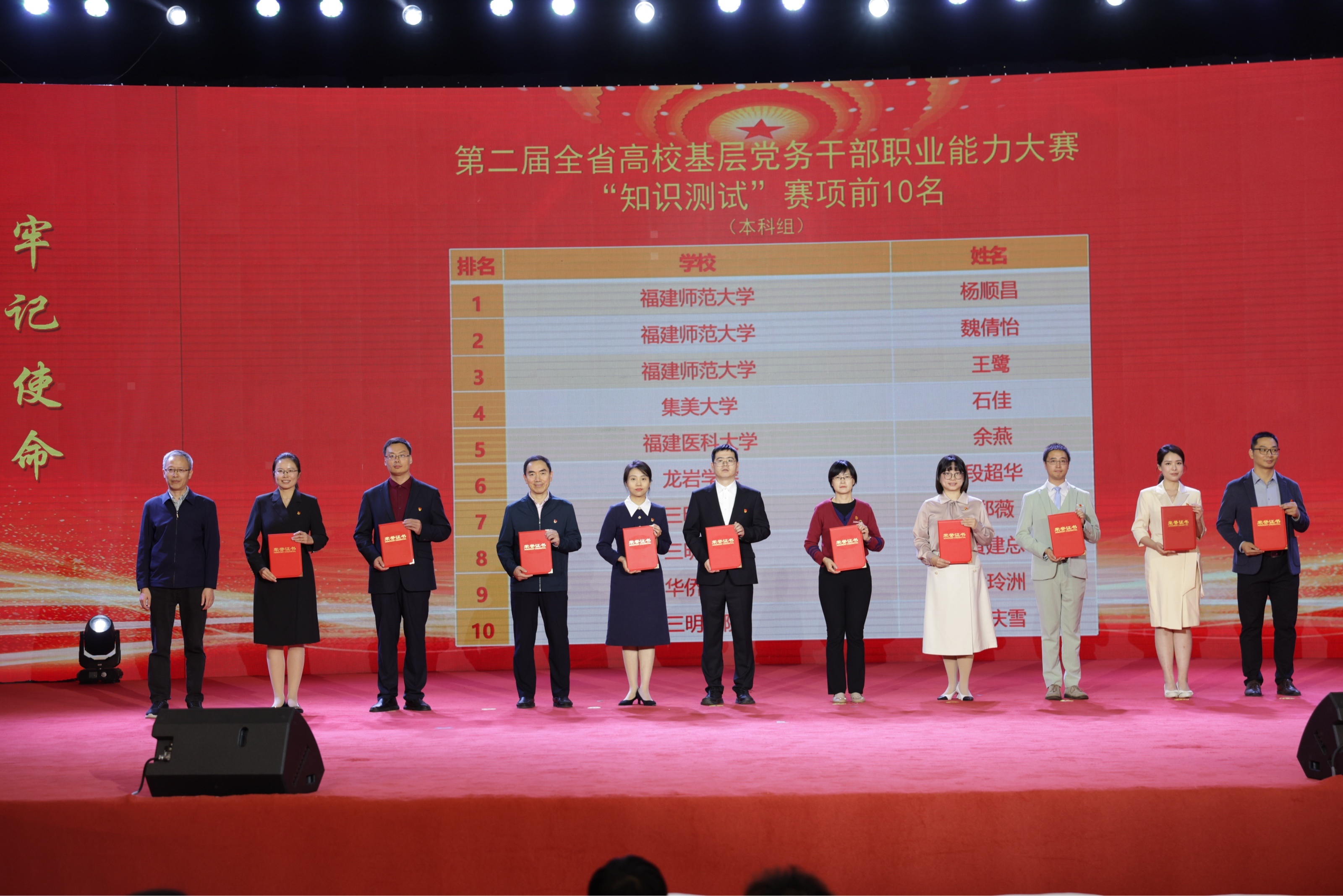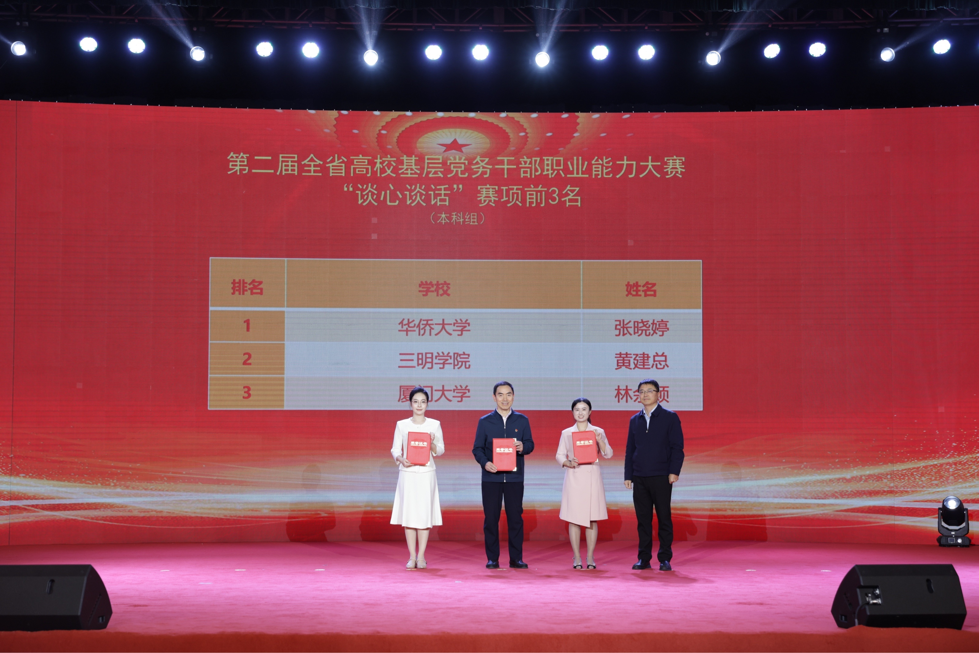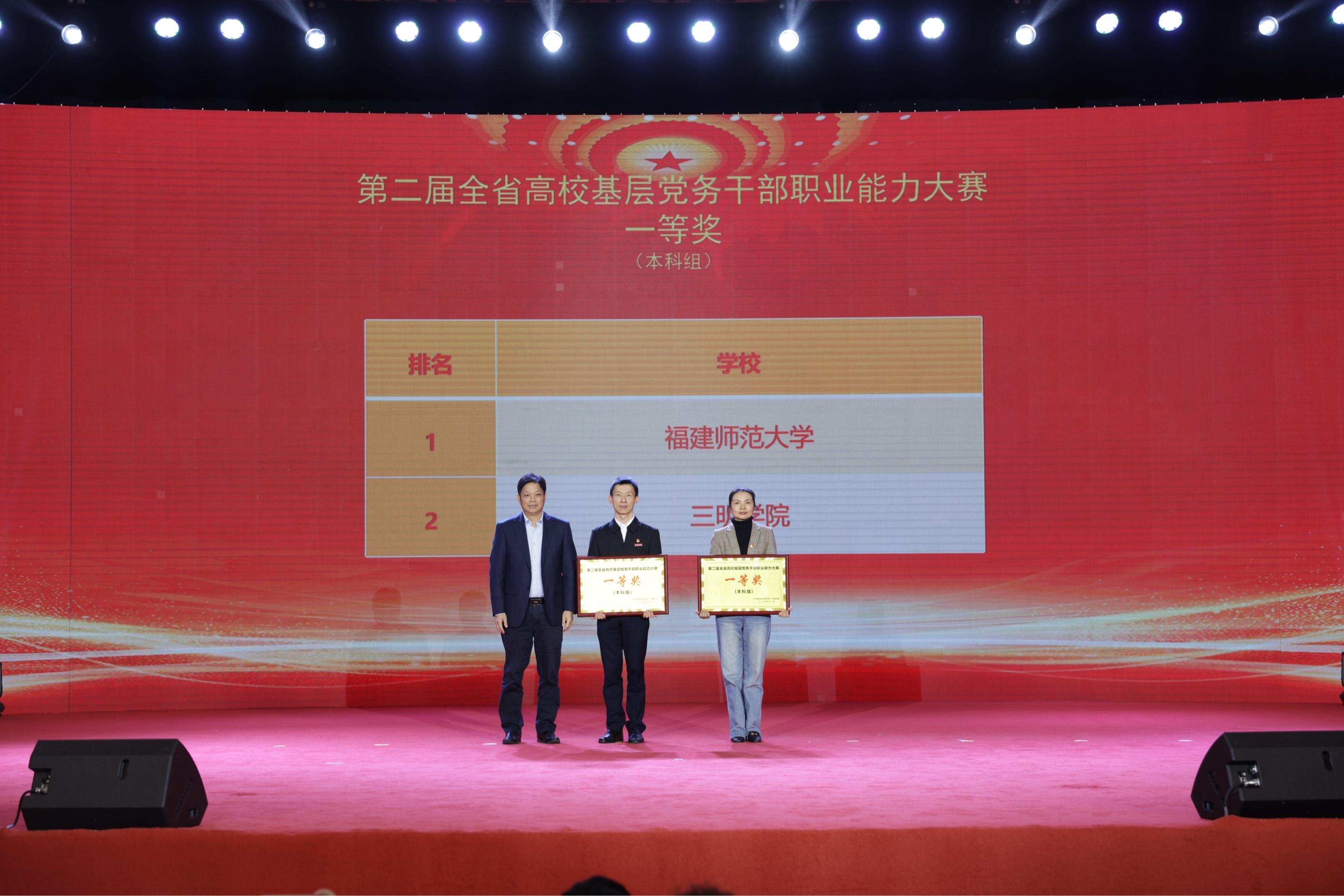 “谈心谈话”赛项前3名(本科组)本次大赛设置“知识测试”“主题党日策划”“微党课”“谈心谈话”4个赛项,旨在贯彻落实全国、全省高校党的建设工作会议精神,进一步提升高校基层党务干部政治素质和业务能力,是全省高校基层党建工作成果的一次集中展示与交流。三明学院三位参赛选手凭借扎实的理论功底、精湛的专业素养和稳定的现场表现力,一路过关斩将,充分展现了我校基层党务工作者过硬的职业素养和昂扬向上的精神风貌。