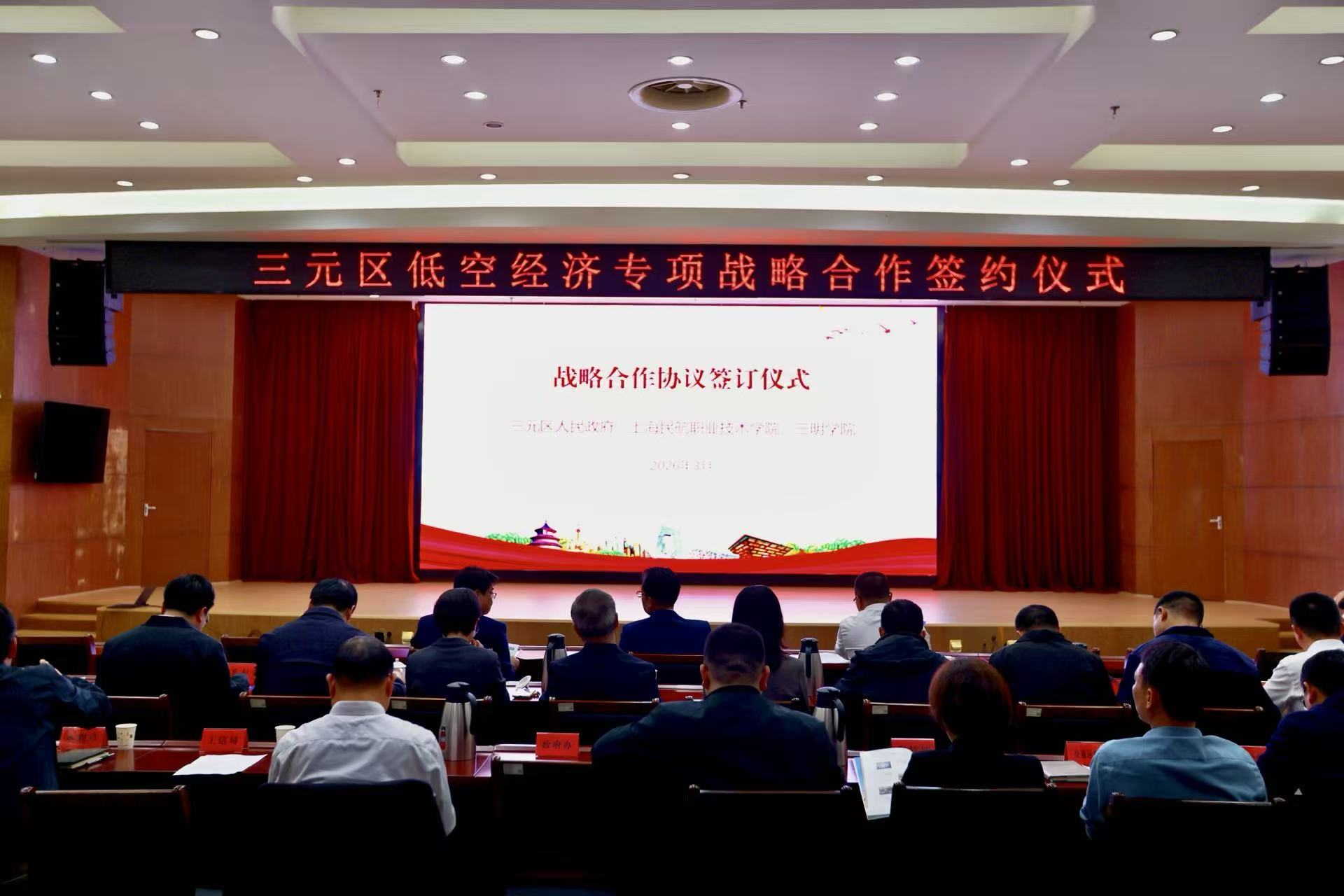 为贯彻落实国家低空经济发展战略,积极服务低空产业发展,扎实推进沪明对口合作,推动低空技术与工程专业建设,3月26日下午,三明学院与三元区人民政府、上海民航职业技术学院共同签订《低空经济专项战略合作协议》。校党委书记陈列平,上海民航职业技术学院党委书记、院长王立新,三元区委副书记、区长洪彬出席签约活动并见证签约。校党委委员、副校长吴龙,上海民航职业技术学院副院长孙暄,三元区政府副区长陈许忠代表三方签约。会议由三元区委常委、副区长张仁涛主持。