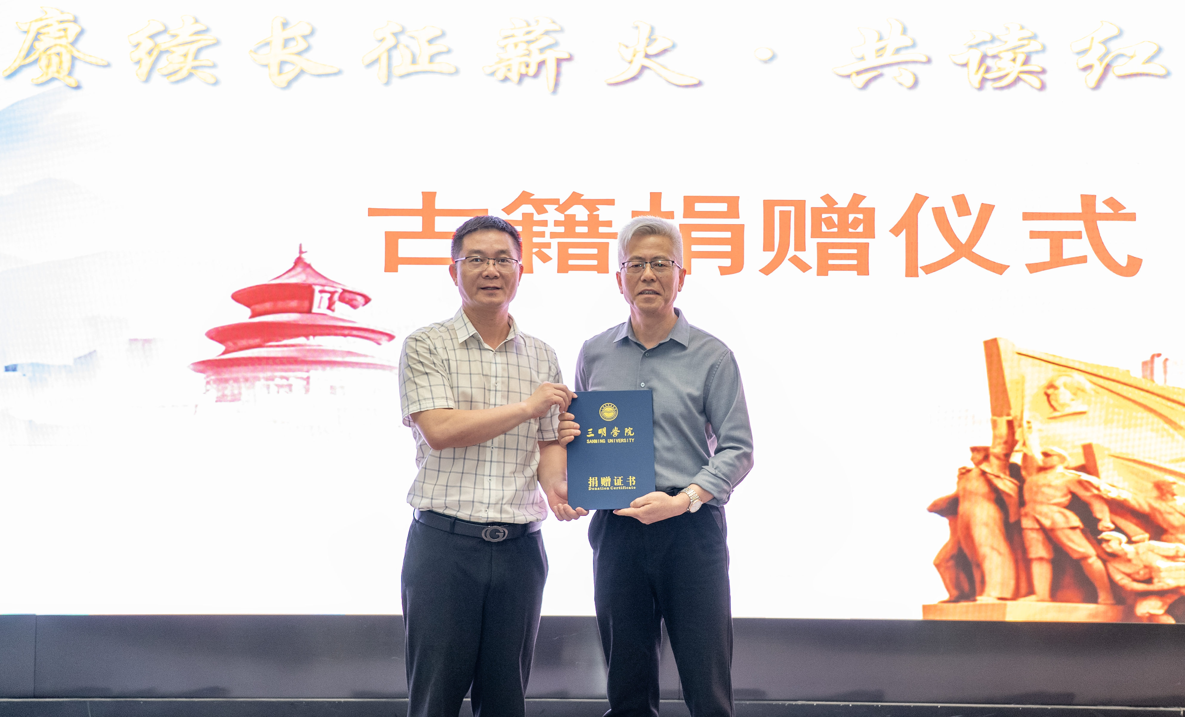 捐赠仪式上,清流县嵩溪客家文献馆馆长杨剑斌向学校捐赠《石城曾氏族谱》《正字通》等线装古籍20种61册,丰富了学校客家文化与地方历史记忆馆藏,为学术研究与校园文化建设提供珍贵资源支撑。